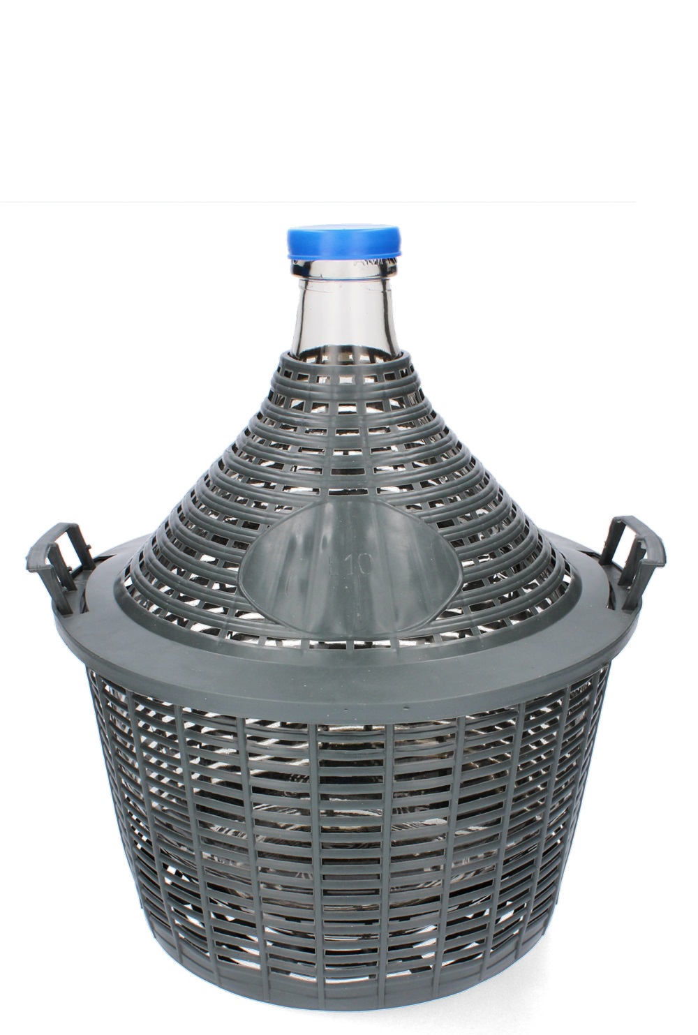 Szklany balon w plastikowym koszu,