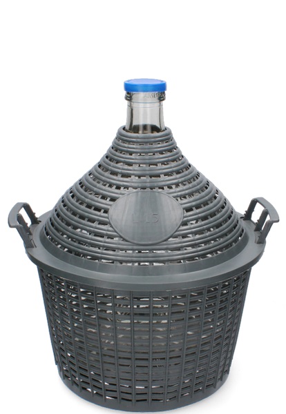 Szklany balon w plastikowym koszu,